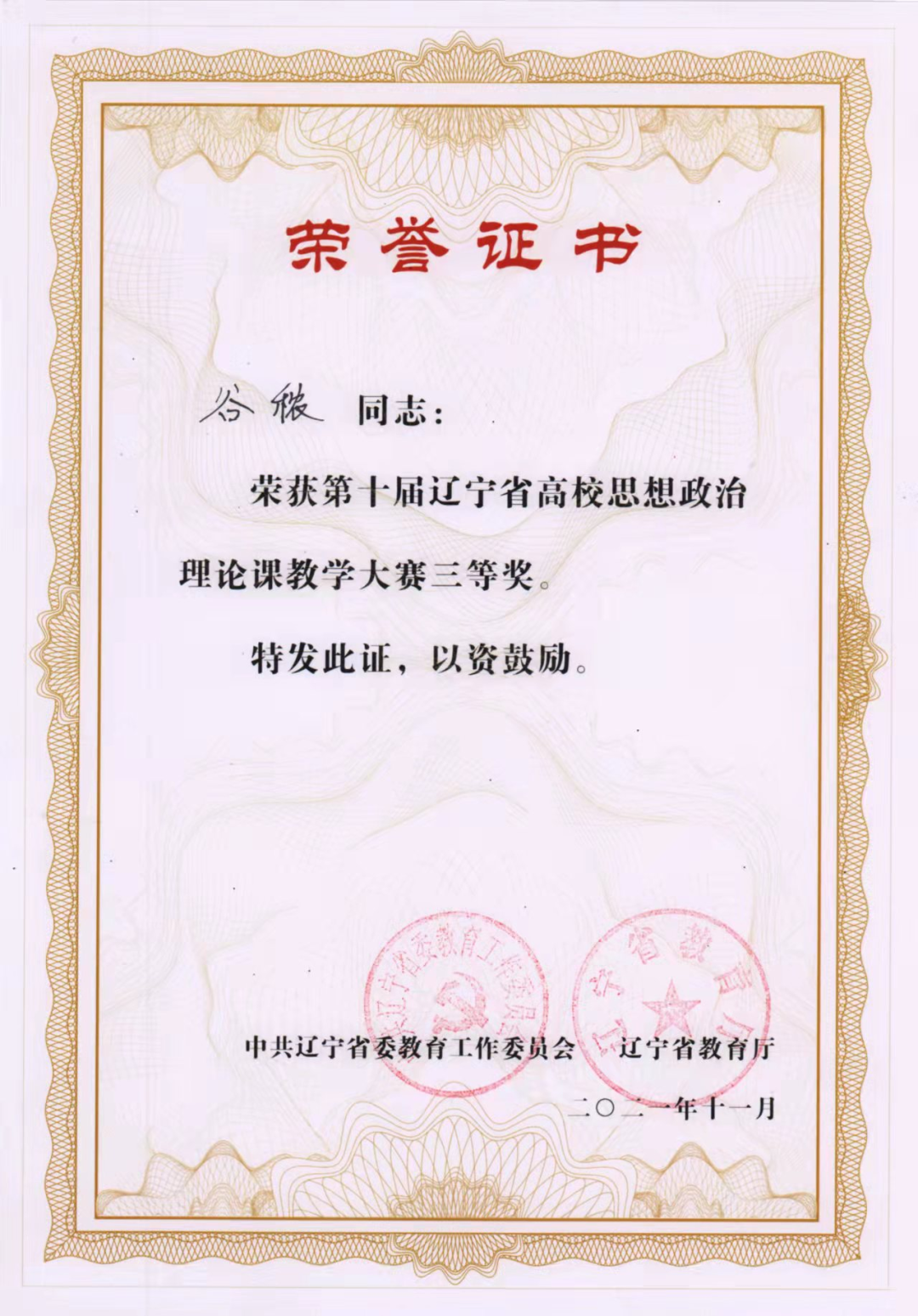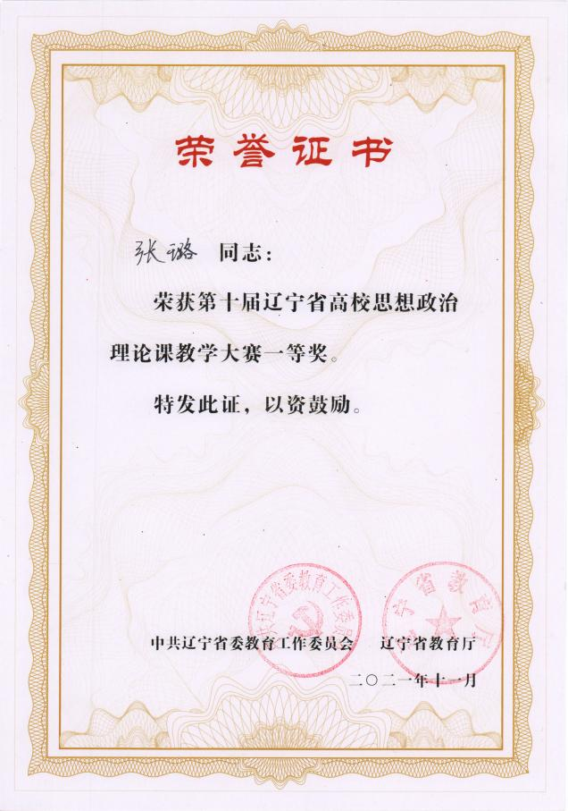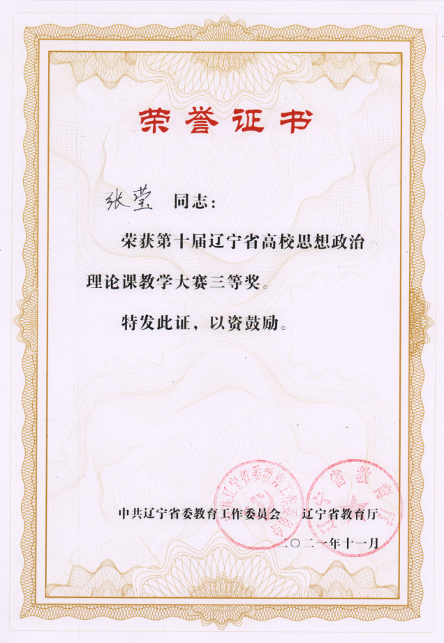 在第十届辽宁省高校思想政治理论课教学大赛中,我校参赛选手经过激烈比拼,从全省103所高校的304名参赛教师中脱颖而出,斩获佳绩。张璐获本科课程——《思想道德与法治》一等奖、谷秾获本科课程——《马克思主义基本原理》三等奖、张莹获本科课程——《毛泽东思想和中国特色社会主义理论体系概论》三等奖。辽宁财贸学院获优秀组织奖。